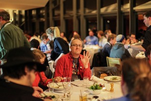 In a bustling dining setting, the focus is on a man in a bright red shirt, who looks directly at the camera with a friendly wave. The atmosphere is lively, illuminated by soft lighting that lends a warm glow to the numerous diners engaged in conversation and meals. Surrounding him, a blend of blurred figures creates a sense of camaraderie and community, enhancing the mood of togetherness and festivity.