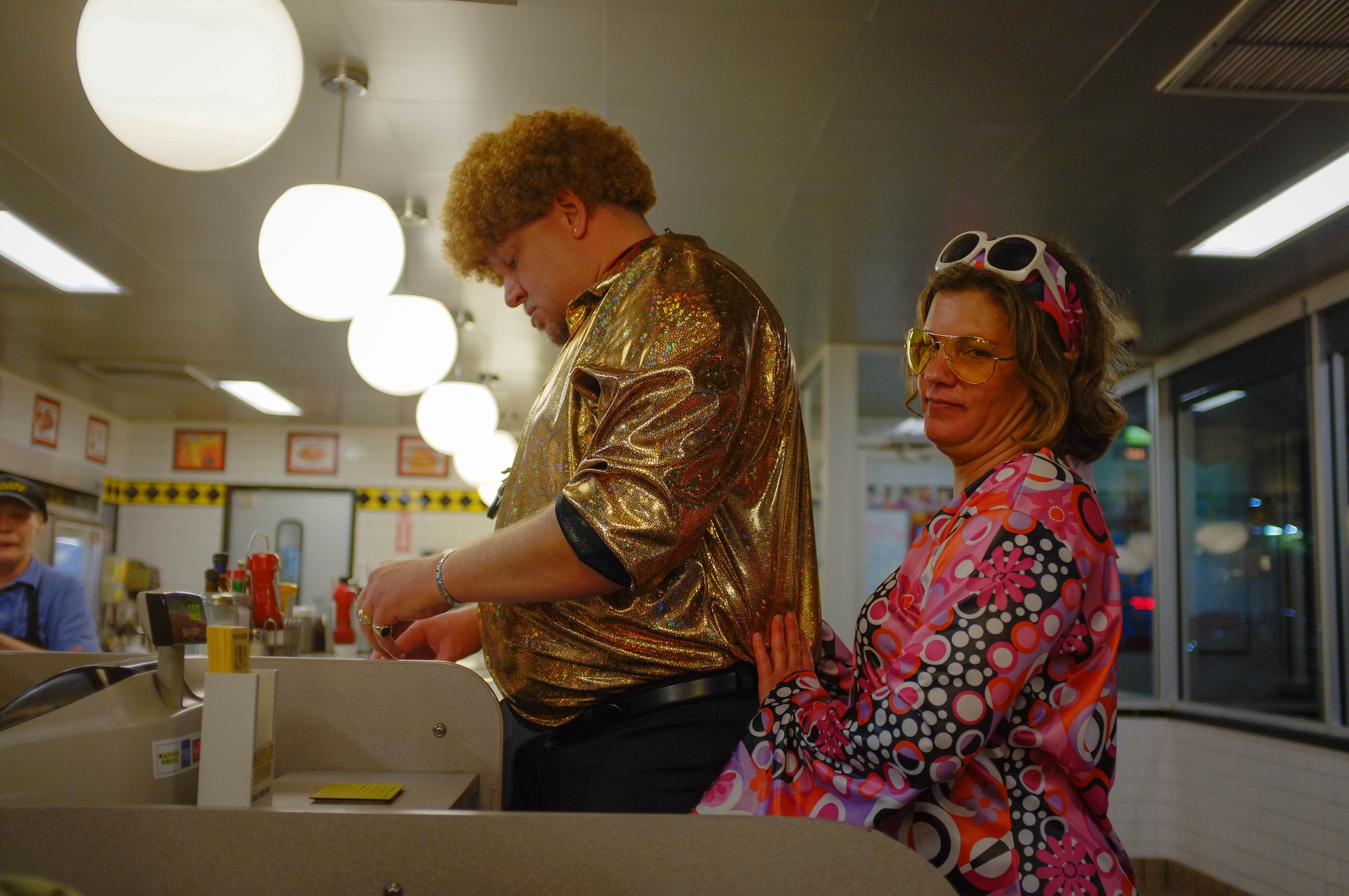 In a vibrant diner setting, a man in a shiny gold shirt stands at the counter, oblivious to the playful gesture of a woman in a colorful retro outfit, who reaches out to him. The warm glow from the overhead lights casts a nostalgic ambiance, highlighting the quirky fashion choices of the subjects. This candid moment captures a mood of lighthearted fun and camaraderie against a backdrop of classic Americana.