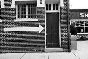 This monochrome photograph captures a stark brick wall featuring a prominently placed door with an arrow pointing towards it. The barred windows and muted tones evoke a sense of confinement and nostalgia, while the clean lines and directional cue add an intriguing layer of purpose. The contrast between the brutal architecture and the soft light hints at stories waiting to unfold.