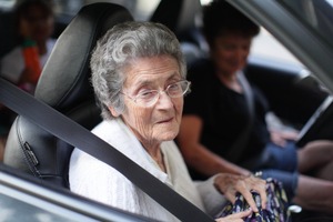 An elderly woman with silver hair and glasses sits in the passenger seat of a car, her expression thoughtful and serene. Soft natural light filters in, capturing a sense of warmth and nostalgia, while the blurred background hints at a busy day outside. The close composition highlights her gentle demeanor, inviting the viewer to ponder the stories she's yet to share.