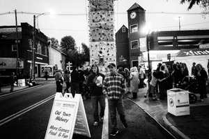 The photograph captures a lively fair atmosphere, with a towering rock-climbing wall central to the scene. In black and white, the street is bustling with people, their interactions infused with a sense of community and fun, as soft evening light casts gentle shadows. An inviting sign hints at games and food, enhancing the festive yet nostalgic mood.