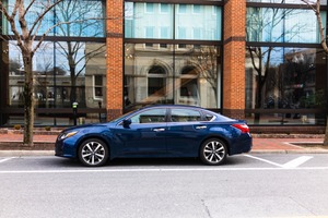 The photograph captures a sleek blue sedan parked neatly along a city street, framed by elegant brick architecture and large glass windows. The soft lighting enhances the mood of calm and stillness, reflecting a moment of urban life frozen in time. With the bare trees hinting at early spring, the composition balances the modern vehicle against the historic backdrop, creating a harmonious juxtaposition.