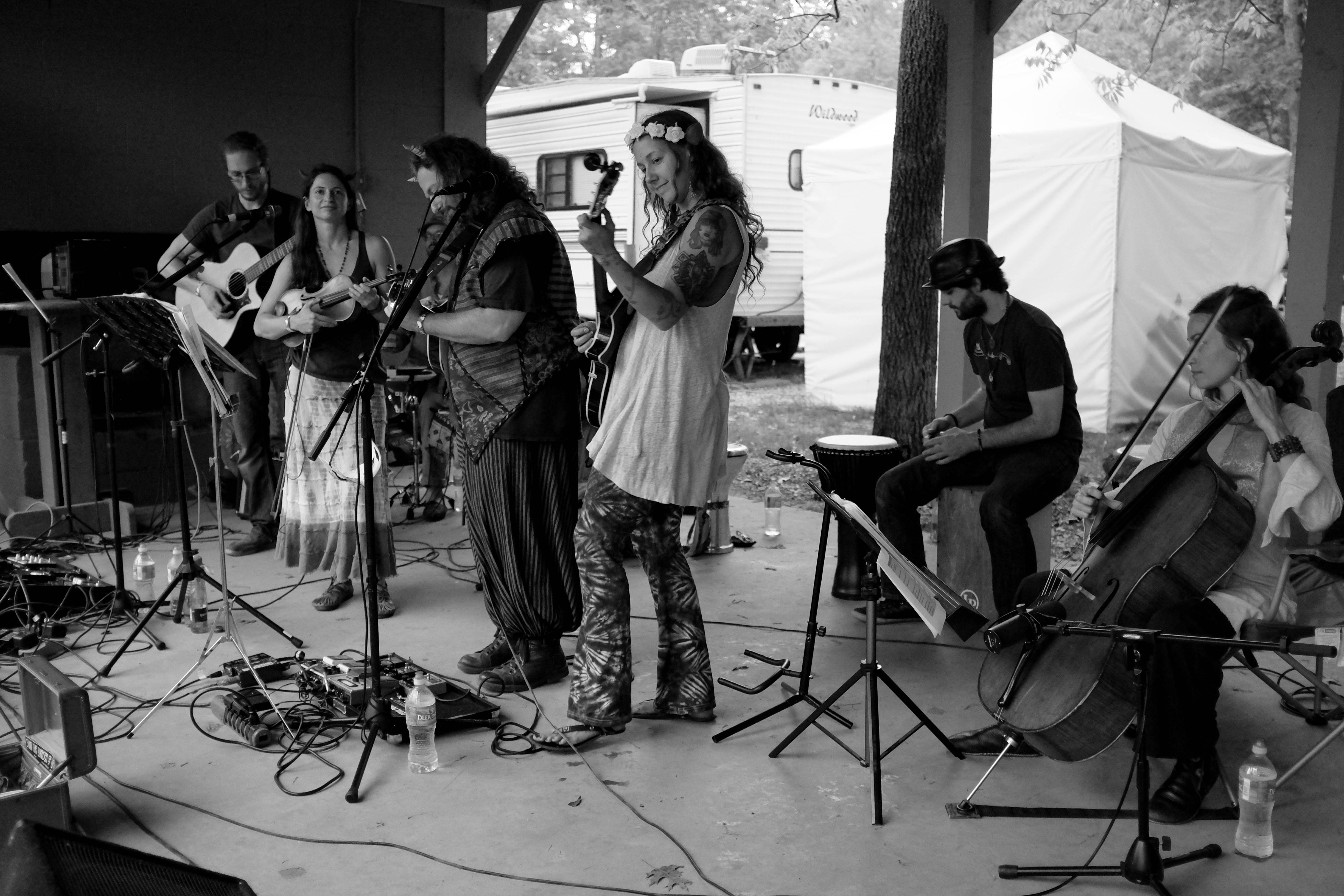 This black-and-white photograph captures a lively outdoor music performance, where a diverse group of musicians plays together with joyful energy. The relaxed ambiance is enhanced by natural lighting filtering through the trees, while the musicians, adorned in eclectic clothing, share a moment of creative connection. The composition communicates a sense of community and artistic expression, inviting viewers to feel the vibrant atmosphere of the festival.