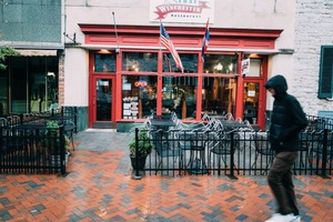 A solitary figure walks past the inviting Winchester Restaurant, its vibrant red facade contrasting with the muted surroundings. The wet pavement reflects the soft, overcast lighting, adding a serene yet slightly melancholic mood. Empty chairs lined outside evoke a sense of quiet anticipation, hinting at stories yet to unfold within.