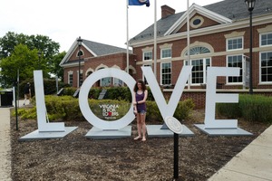 In a vibrant summer scene, a young woman stands next to a giant 'LOVE' sculpture, capturing the playful spirit of Virginia's iconic phrase. The warm sunlight bathes the scene, highlighting the cheerful atmosphere and contrasting the bold letters against the quaint brick building behind. Lush greenery frames the installation, enhancing the sense of connection and community in this joyful moment.