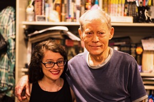 The photograph captures a warm moment between two individuals, standing closely together against a backdrop of books and belongings that evoke a cozy, lived-in space. Soft lighting highlights their genuine smiles, reflecting a sense of comfort and familiarity, while the cluttered shelves suggest a rich tapestry of shared stories and experiences.