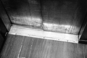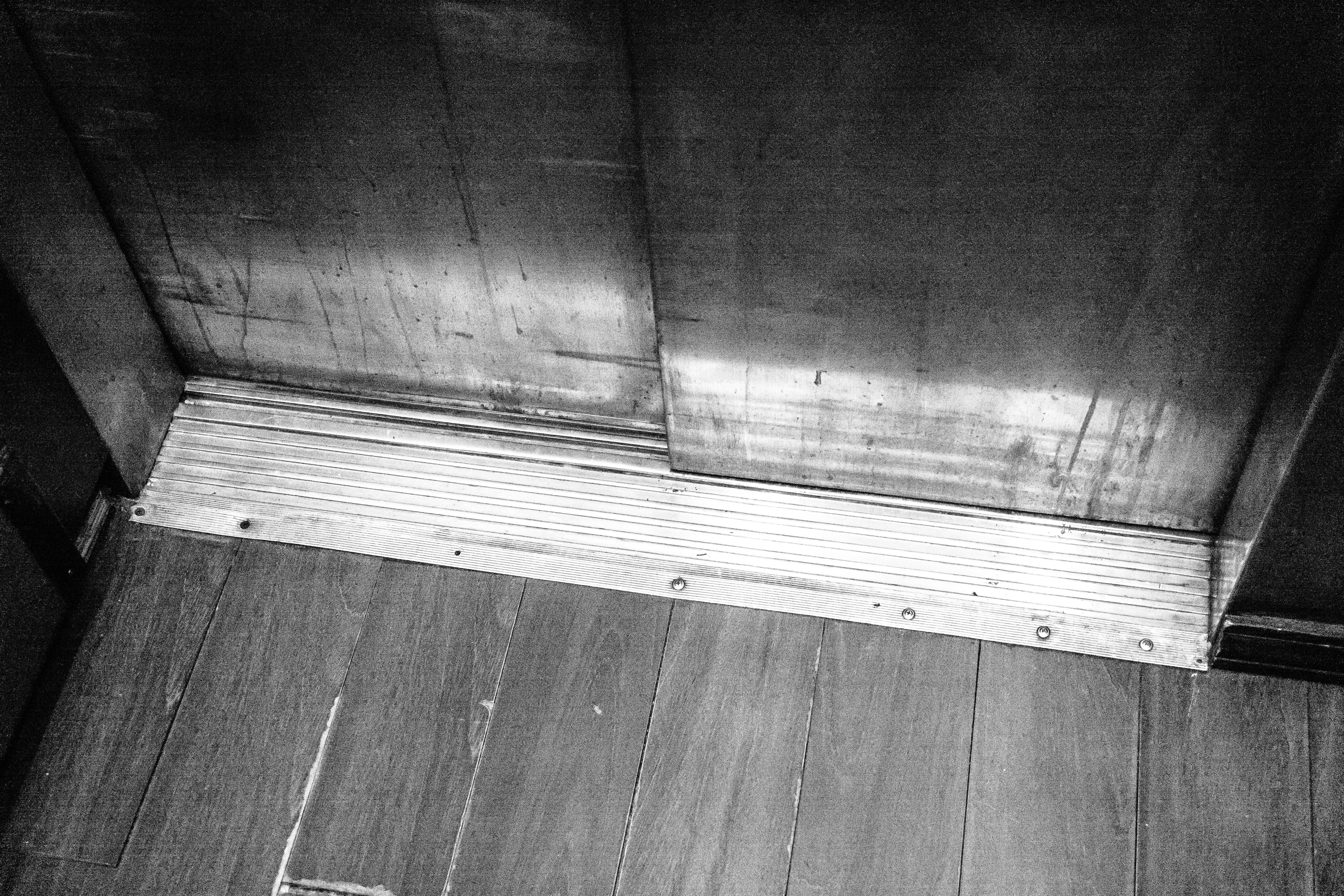 This photograph captures the bottom corner of an elevator, focusing on the metallic threshold against a backdrop of polished wood. The composition conveys a sense of isolation, with the stark contrast of textures highlighted by soft, diffused lighting. The monochrome palette adds a feeling of nostalgia and introspection, inviting viewers to ponder the stories that unfold in such mundane settings.