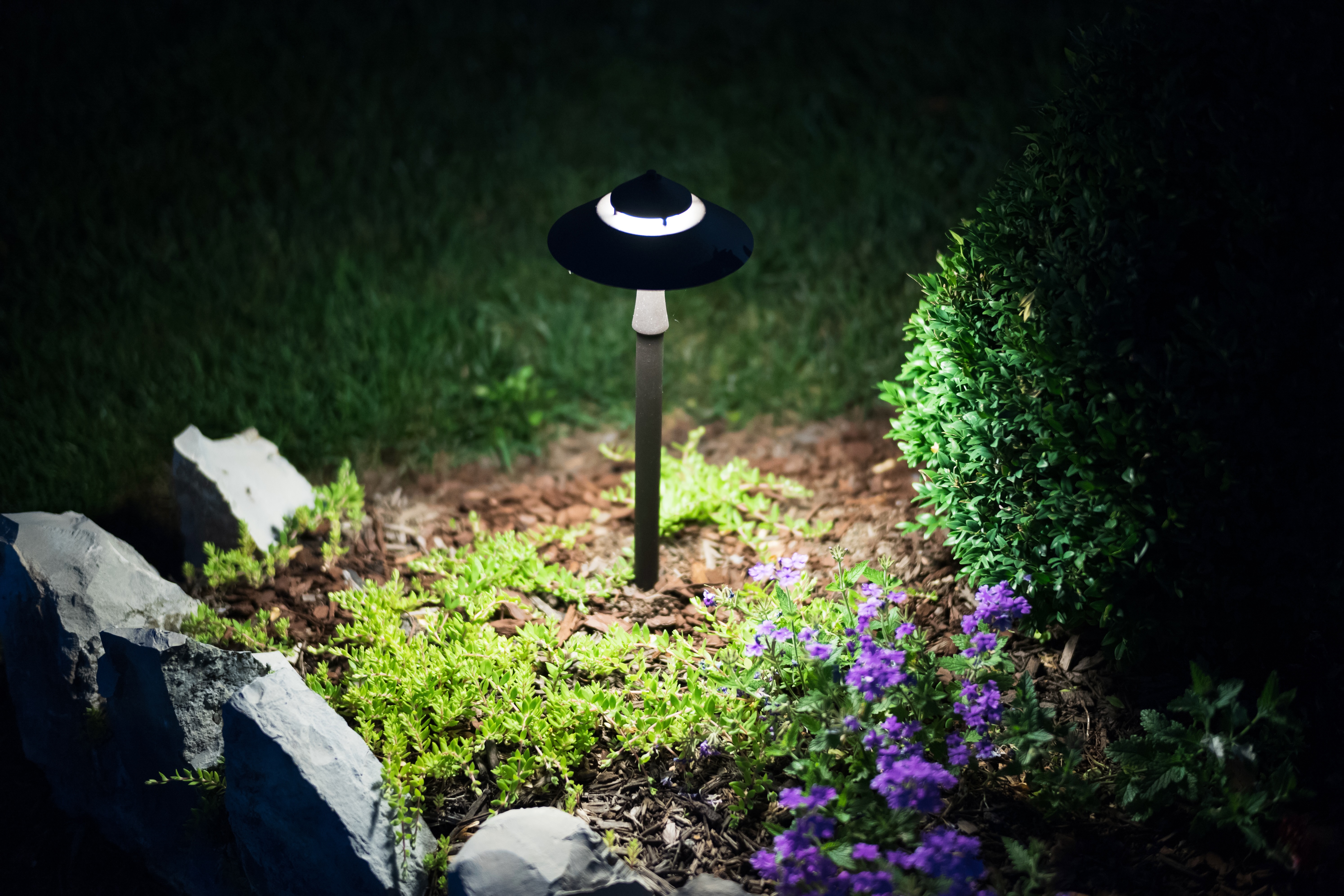 A solitary garden light stands sentinel amidst a patch of vibrant greenery and delicate blooms. The soft glow emanating from the lamp creates a warm contrast against the surrounding darkness, inviting a sense of tranquility and nighttime allure. The composition highlights the interplay of light and shadow, emphasizing nature's beauty in a tranquil evening setting.