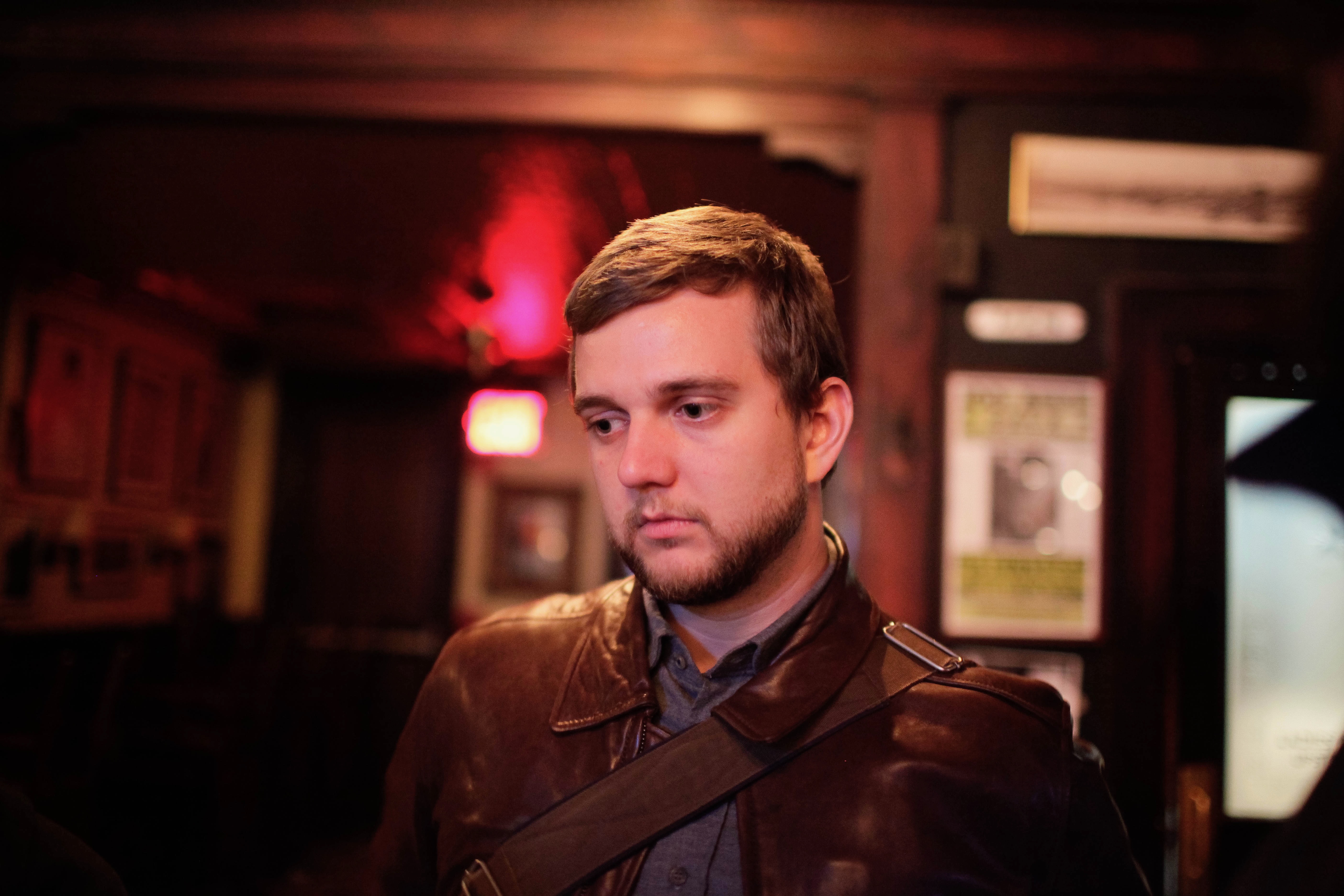 The photograph captures a young man deep in thought, dressed in a dark leather jacket against a backdrop of dimly lit bar decor. The warm, subtle lighting contrasts with the cool tones of his expression, creating an introspective mood. His distant gaze suggests a moment of reflection or melancholy, inviting the viewer to ponder his story.