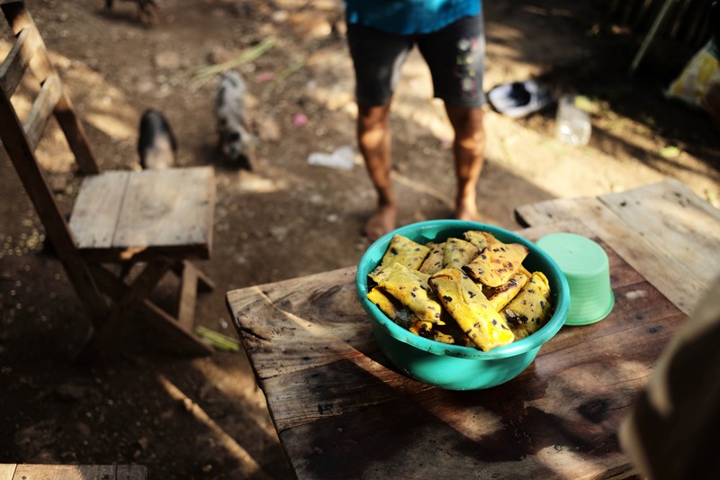 A vibrant blue bowl brims with freshly made food, inviting and warm, as soft sunlight casts gentle shadows in the rustic setting. In the background, the blurred figure of a person stands amidst a natural, earthy landscape, adding a sense of life and community to the scene. The texture of the wooden table and the casual arrangement of furniture evoke a relaxed, homely atmosphere.
