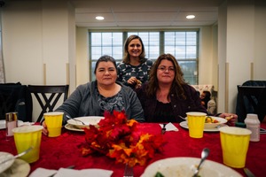 Three women share a moment at a warmly set table, adorned with colorful autumn leaves. The composition emphasizes camaraderie and warmth, with soft natural light filtering through the windows, creating a cozy atmosphere. Their expressions suggest a blend of joy and connection, inviting the viewer into this intimate gathering.