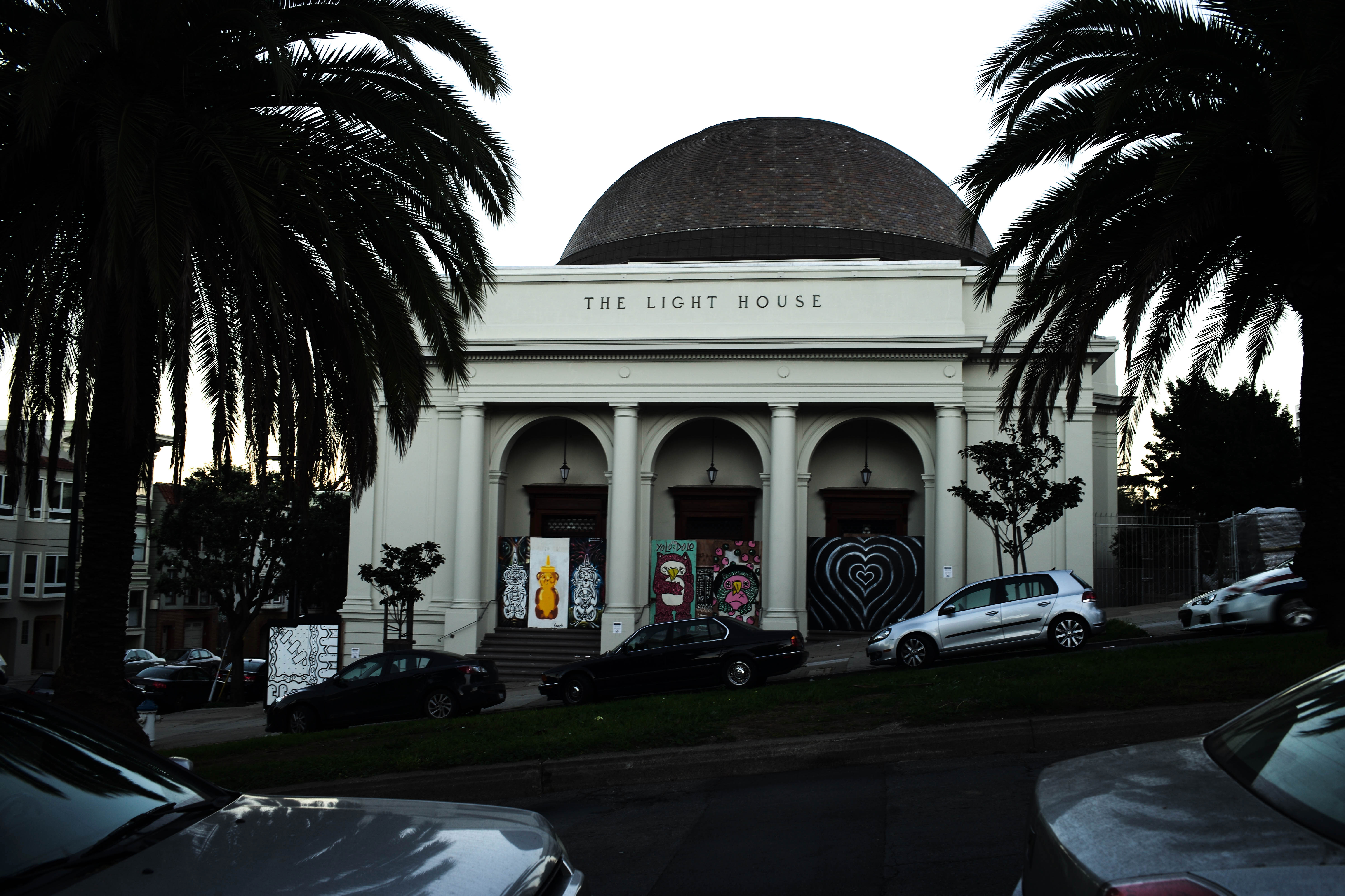 The photograph captures an elegant building titled 'The Light House', framed by lush palm trees that enhance its architectural beauty. Bold street art adorns its entrance, contrasting with the soft evening light that casts a serene yet vibrant mood. The composition invites viewers to explore the interplay between art, architecture, and the urban landscape.
