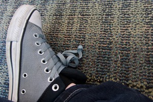 The photograph features a close-up of a gray sneaker resting on a textured, colorful carpet. The muted tones of the shoe contrast with the rich, woven patterns of the floor, evoking a sense of casual comfort. Soft lighting enhances the relaxed mood, inviting a moment of pause in an everyday setting.