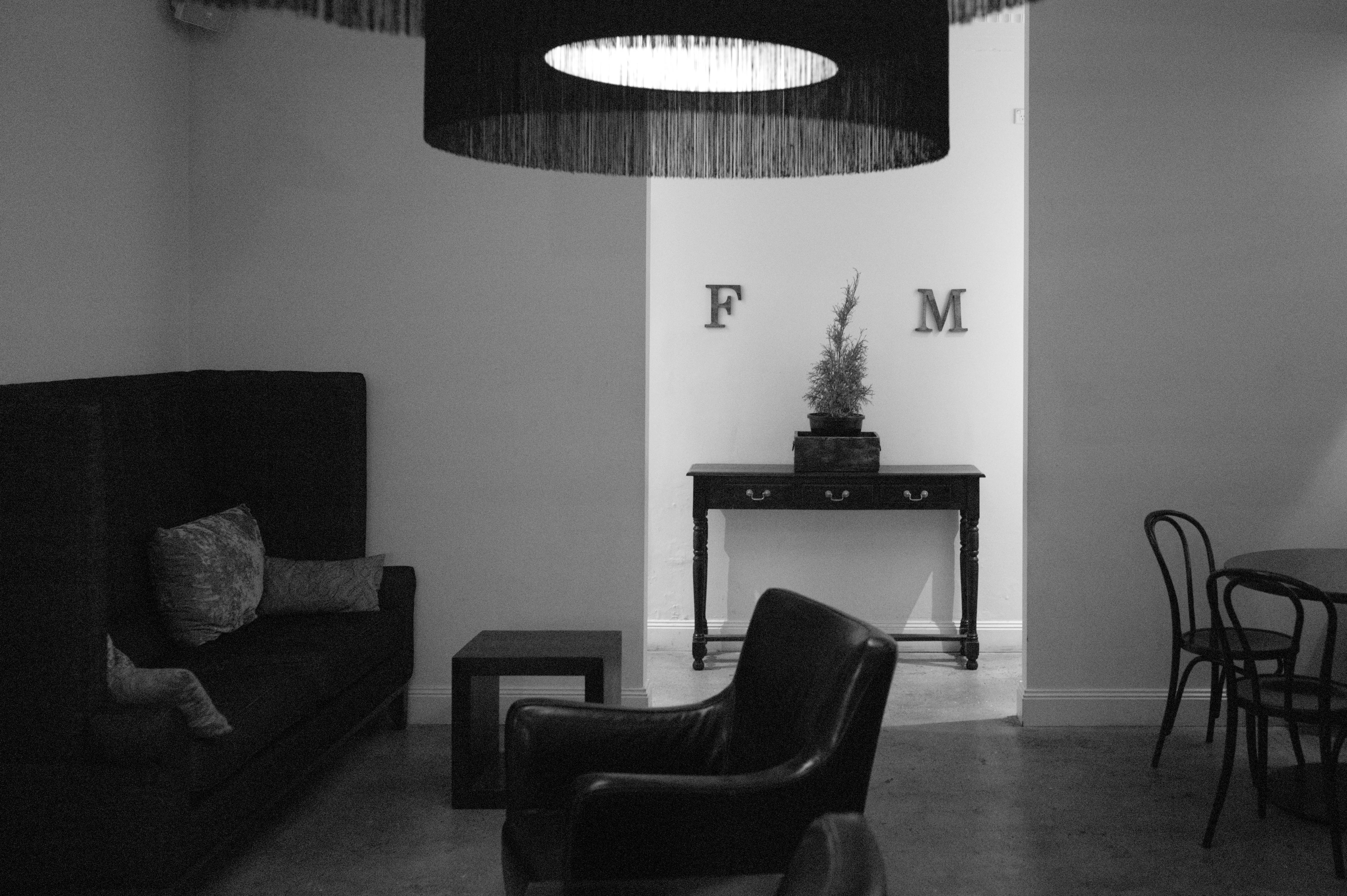 This black and white photograph captures a minimalist interior, showcasing a cozy sitting area with contrasting textures. A large, fringed light fixture hangs overhead, casting a soft glow on the dark furniture while highlighting the subtle details of the wall, adorned with the letters 'F' and 'M' and a small potted plant. The composition invites tranquility, creating a perfect blend of shadows and light that evokes a sense of intimate comfort.