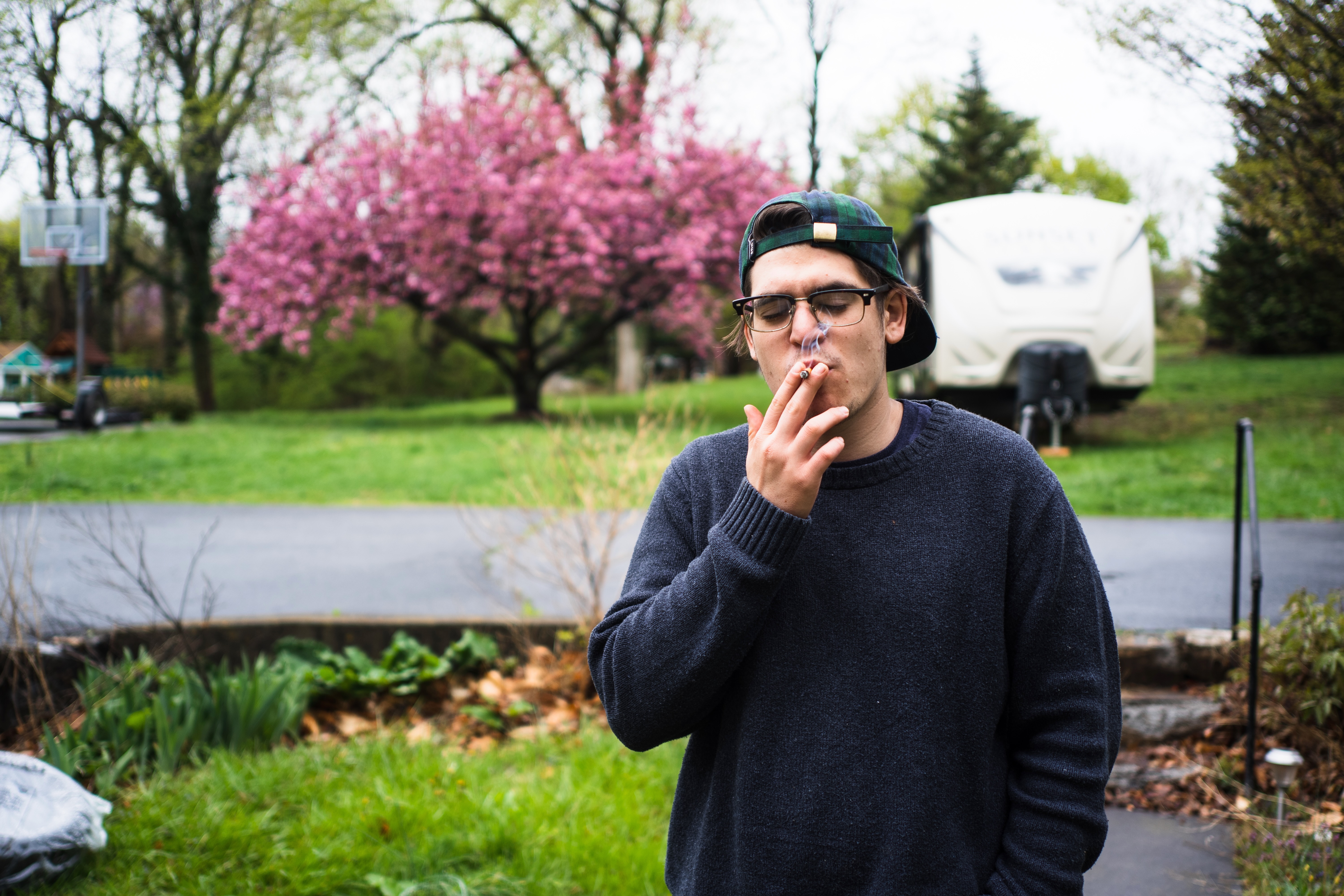 A young man stands in a residential yard, exhaling smoke that dissipates into the cool, damp air. Behind him, vibrant pink blossoms contrast sharply with the muted tones of his sweater and the cloudy sky, creating a mood of introspection and calm. The composition balances the figure with the blossoming tree, infusing a sense of fleeting beauty into an otherwise ordinary moment.