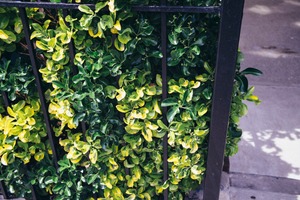 This photograph captures a vibrant display of lush green and yellow foliage, tightly interwoven with the black iron bars of a fence. The play of light creates a serene and inviting atmosphere, emphasizing the contrast between the organic and the man-made. Soft shadows dance across the pavement, adding depth to the composition and evoking a sense of calmness in an urban setting.