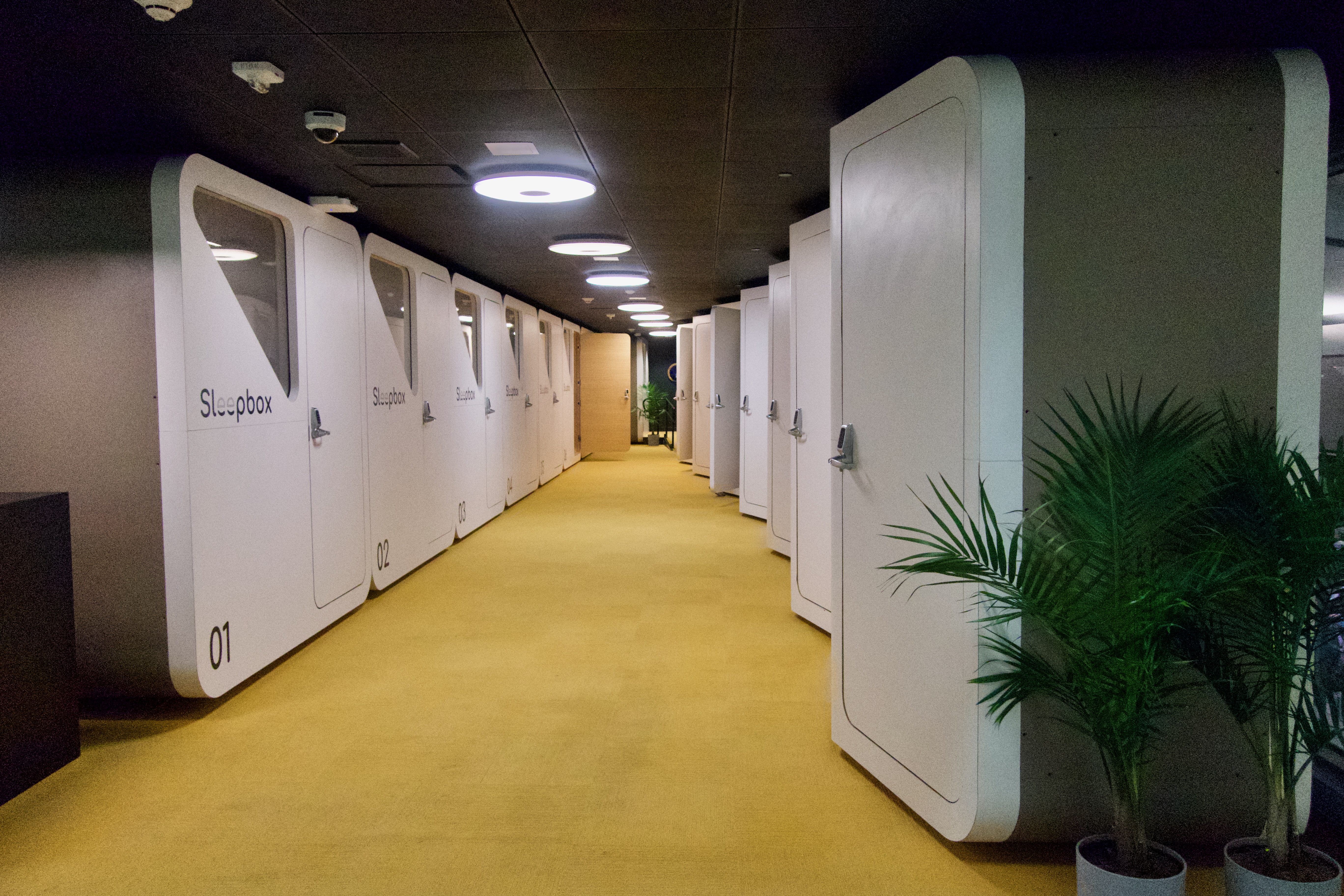 This photograph captures a serene corridor lined with minimalist sleep pods that offer a modern refuge for weary travelers. The warm yellow carpet contrasts softly with the sleek white doors, creating a calm and inviting atmosphere. Subtle overhead lighting enhances the tranquil mood, suggesting a peaceful escape from the bustle of daily life.