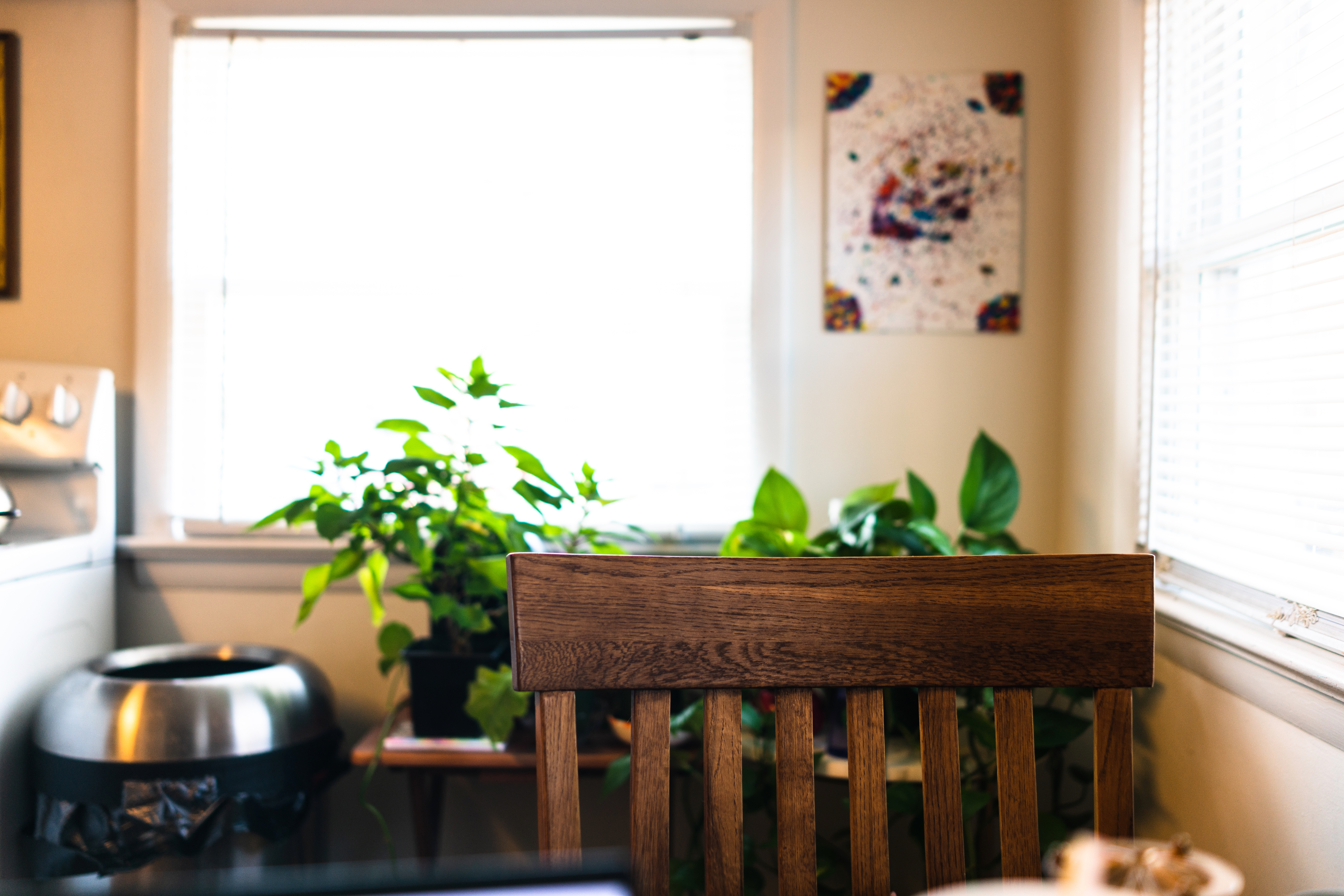 A solitary wooden chair stands in a sunlit kitchen, evoking a serene and inviting atmosphere. Lush green plants frame the scene, their vibrant leaves contrasting with the warm tones of the chair and the soft light streaming through the window. The composition suggests a moment of pause, inviting the viewer to imagine the stories shared in this cozy space.