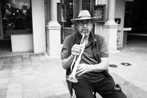 A seasoned musician, clad in a simple vest and a wide-brimmed hat, passionately plays his trumpet, his expression reflecting a deep connection to the music. The urban backdrop and soft monochromatic tones add a nostalgic ambiance, encapsulating a moment of artistic solitude amidst the bustling city. The composition draws attention to the musician’s focused demeanor, harmonizing with the rhythmic patterns of the cobblestone path below.