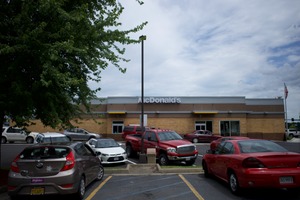 This photograph captures a McDonald's restaurant flanked by parked cars under a partly cloudy sky. The composition highlights the familiar façade of the fast-food establishment, evoking a sense of suburban routine and everyday convenience. Soft, natural light filters through the clouds, creating a relaxed yet commercial mood.
