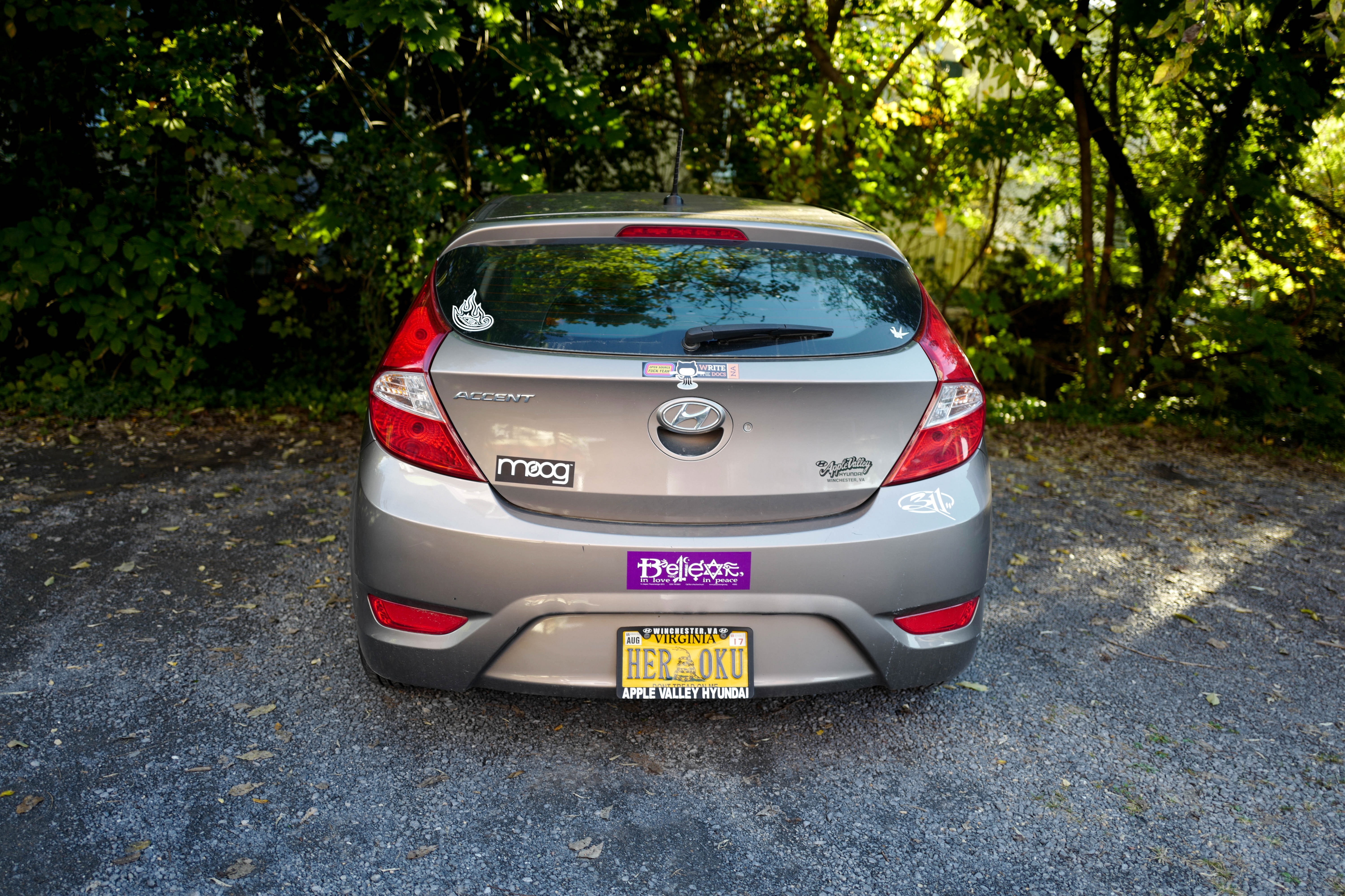 The photograph captures a silver Hyundai Accent parked peacefully in a sun-dappled area, surrounded by vibrant greenery. Stickers on the rear bumper add a playful personal touch, hinting at the owner's personality. Soft sunlight filters through the leaves, creating a warm and inviting atmosphere that gives the scene a sense of tranquility.