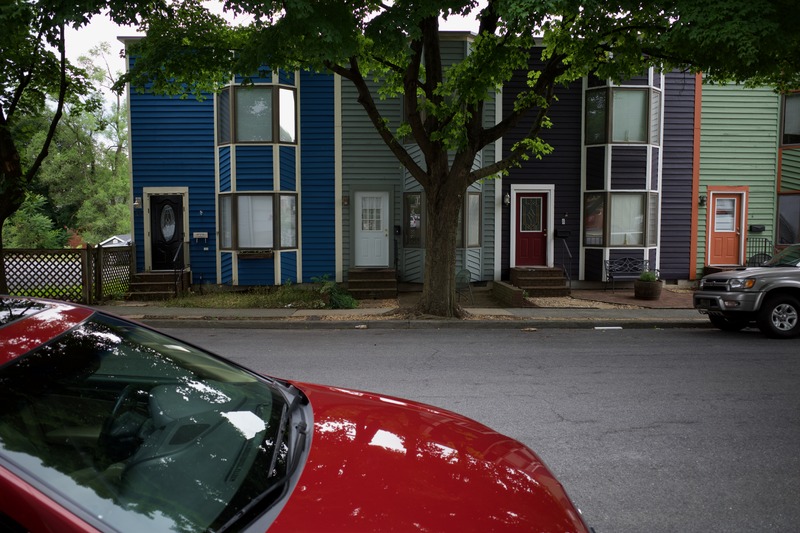 This photograph captures a row of quaint, multicolored houses lined up against a tree-lined street. The cool tones of blue, green, and purple stand out against the warm red of a parked car, creating a vibrant contrast that evokes a lively yet tranquil neighborhood atmosphere. Soft lighting filters through the leaves, casting gentle shadows and enhancing the sense of calm in this urban setting.