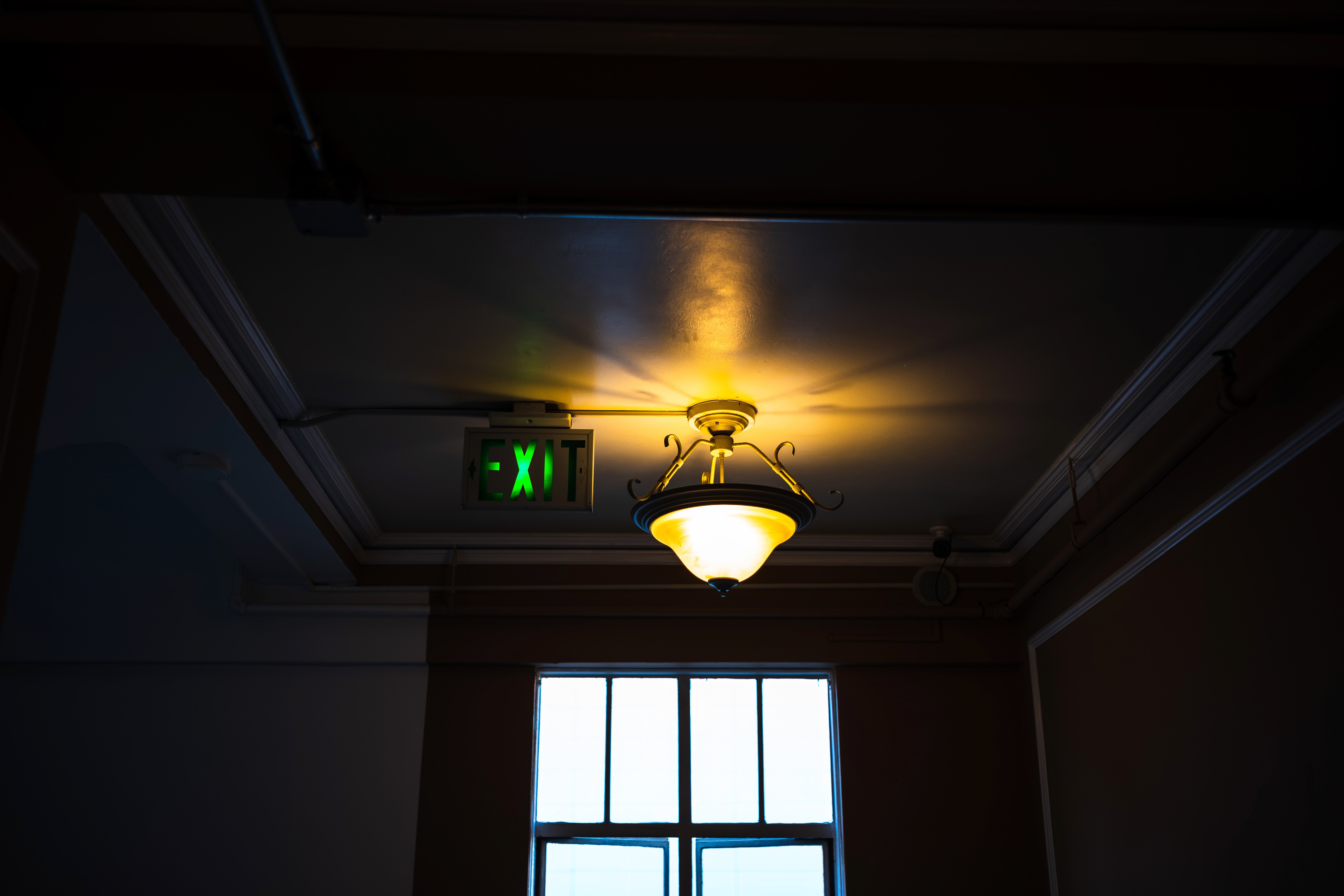 The photograph captures a softly lit ceiling fixture illuminating a dim corridor. An exit sign glows in vibrant green, contrasting the warm light of the lamp above. This interplay of light creates a mood of quiet contemplation, hinting at a passage or transition in space.