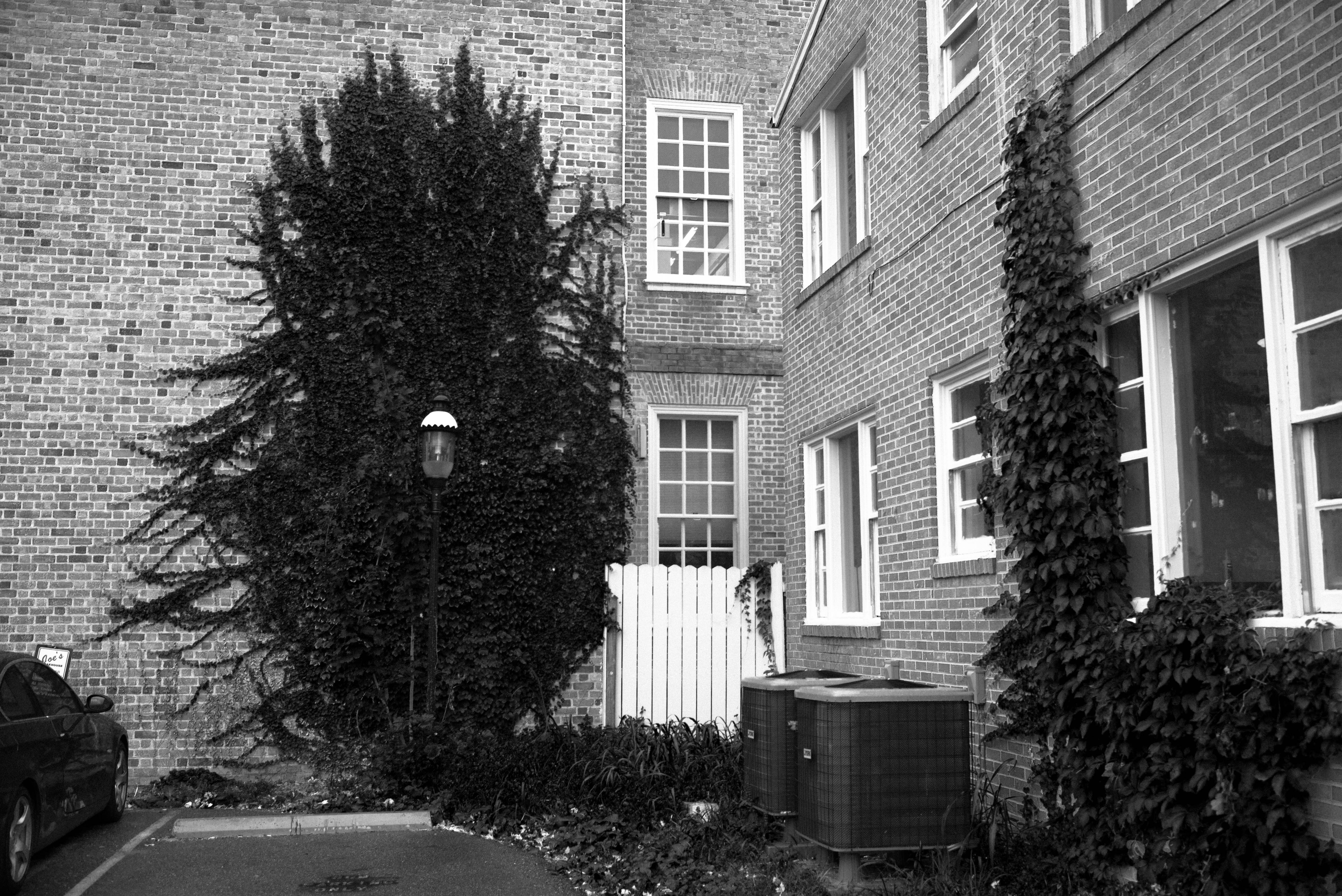 This black-and-white photograph captures a striking contrast between the rigid brick walls of a building and the organic forms of climbing ivy. The mood is contemplative, with soft shadows playing across the surfaces, emphasizing the tension between nature and urban life. A solitary lamp post in the foreground adds a touch of nostalgia, inviting the viewer to ponder the history ingrained in this quiet corner.