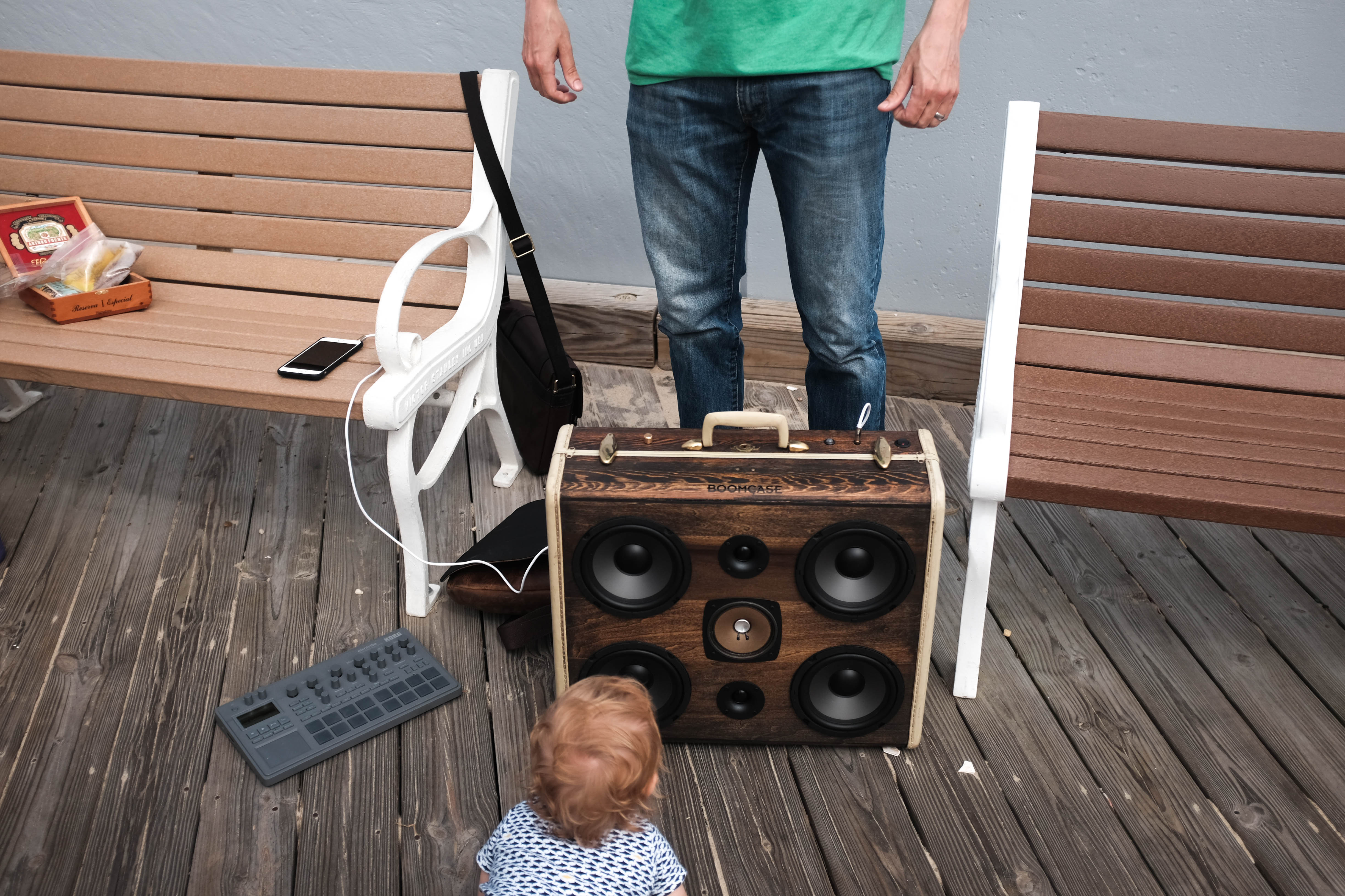 A casual outdoor scene captures a man standing beside a large, rustic speaker while a curious toddler kneels on the wooden floor, mesmerized by the sound. Sunlight gently illuminates the moment, casting a warm glow that enhances the relaxed atmosphere. The contrast between the sturdy adult presence and the small child adds a whimsical touch to the setting, suggesting a shared love for music and exploration.