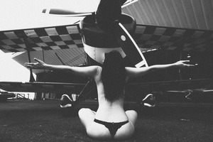 The photograph captures a striking contrast between the graceful figure of a woman and the imposing presence of an airplane. With arms outstretched, she exudes a sense of liberation amidst the industrial backdrop. The black-and-white composition enhances the mood, lending a timeless quality that accentuates both beauty and strength.