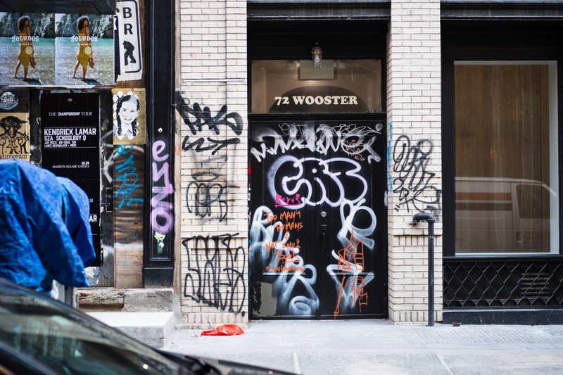 The photograph captures a gritty urban scene at 72 Wooster, where the door is overlaid with layers of colorful graffiti, showcasing a striking contrast against the muted brick background. Posters for live events peek through the chaos, hinting at a vibrant cultural backdrop, while the soft, natural light bathes the space in a nonchalant ambiance. The mood is raw and unfiltered, inviting the viewer to contemplate the stories behind the graffiti and the life bustling just out of frame.