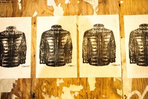 This photograph captures a trio of posters featuring a black and white depiction of a jacket, each conveying the bold message that "YOU ALL LOOK THE SAME." The composition presents a striking visual repetition against the textured backdrop of weathered wood, evoking a sense of commentary on conformity and identity. The warm lighting adds a subtle glow, enhancing the gritty and urban atmosphere of the piece.