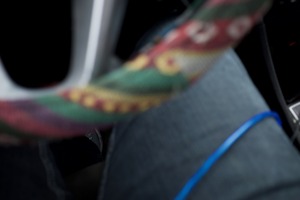 The photograph captures a moment from inside a car, highlighting the textured steering wheel cover and an out-of-focus denim-clad leg. The soft, diffused lighting creates a calm yet subdued mood, while the vibrant colors of the steering wheel add an unexpected pop against the dark interior. This composition evokes a sense of everyday exploration, presenting a candid glimpse into life on the road.