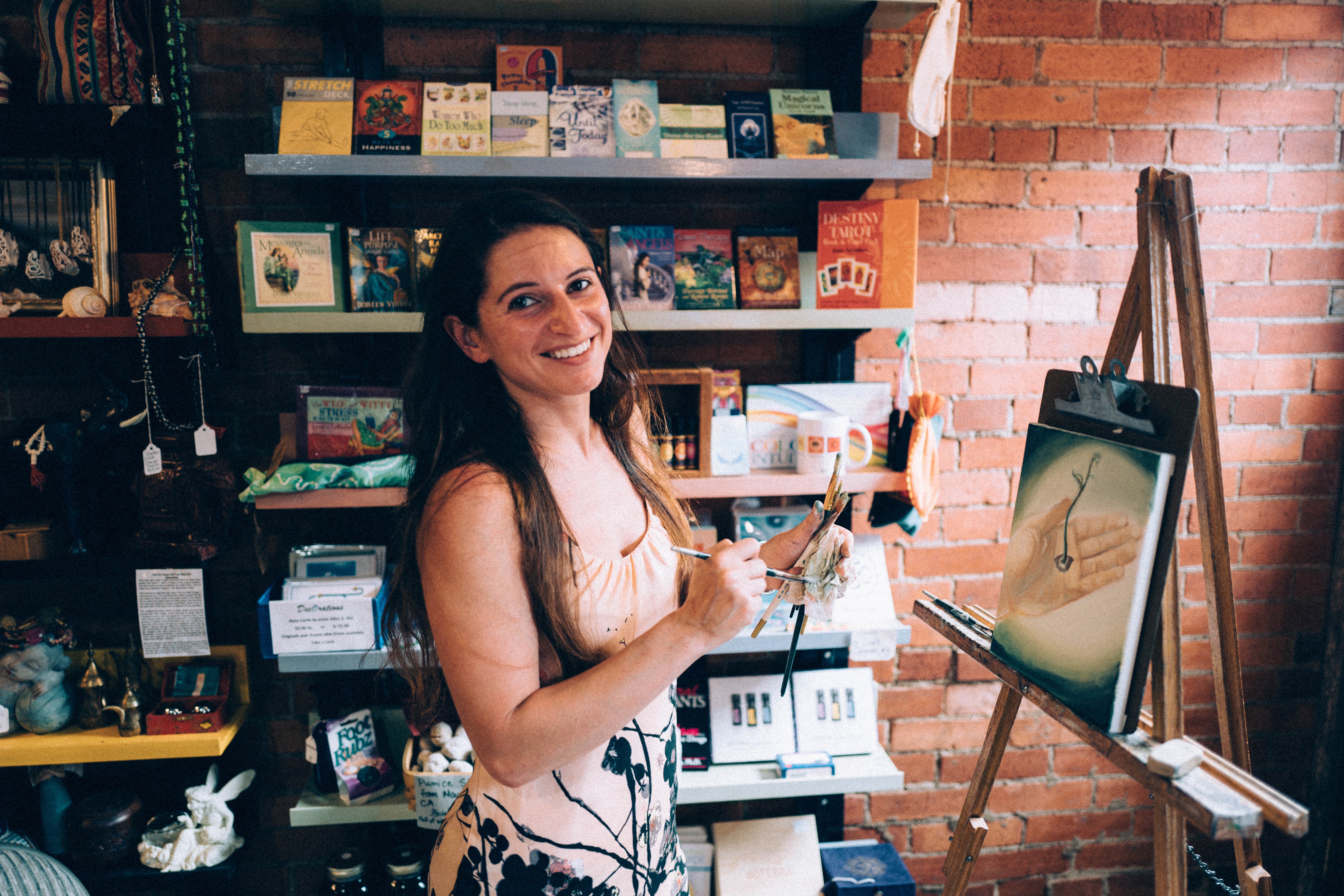 In a cozy, eclectic space filled with colorful merchandise, an artist captures the moment as she paints. Her warm smile and confident posture exude a sense of joy and passion for her craft, while the soft, natural light accentuates the rich textures of the brick wall and various art supplies surrounding her.