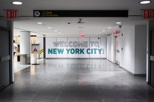 The photograph captures a spacious airport hallway leading to a vibrant, welcoming mural that reads "WELCOME TO NEW YORK CITY!" The bright colors of the sign contrast with the sleek, polished floor and subdued lighting, creating a mood of excitement and anticipation as travelers arrive. The composition emphasizes the welcoming message, inviting newcomers to embrace the city's energy and spirit.