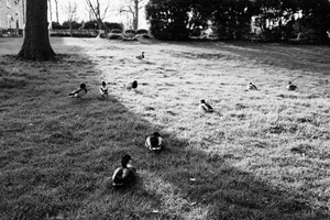 A serene scene captures ducks scattered across a sunlit lawn, their forms highlighted against the soft texture of the grass. The black-and-white contrast emphasizes the play of light and shadow, creating a tranquil atmosphere that invites contemplation. The composition guides the eye through the peaceful landscape, evoking a sense of calm in the simplicity of nature.