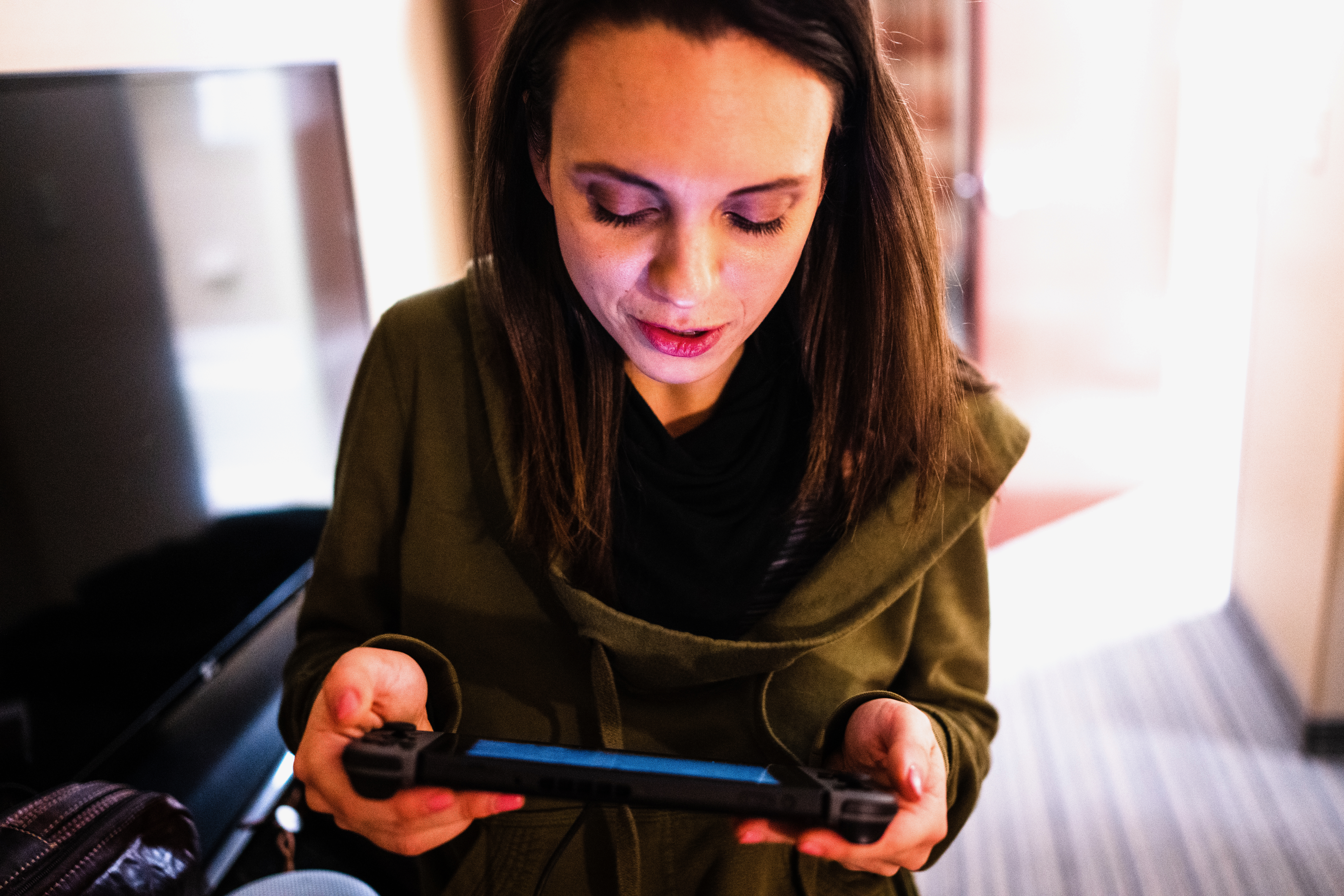 The photograph captures a woman engrossed in a gaming device, her expression reflecting concentration and intrigue. The warm, soft lighting creates an intimate atmosphere, while the blurred background accentuates her focused demeanor. Her casual attire and the cozy setting evoke a sense of comfort and leisure.