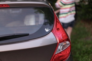 The photograph captures the back of a car, adorned with a delicate white origami crane sticker, symbolizing journey and freedom. Soft, natural lighting bathes the scene, creating a warm, inviting mood that contrasts with the sharp lines of the vehicle. In the background, a figure in a colorful striped shirt hints at adventure, deepening the sense of connection to movement and exploration.