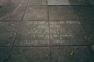 This photograph captures a poignant message written in chalk on concrete, expressing solidarity with Oakland and its community affected by tragedy. The soft, natural lighting enhances the raw emotion of the scene, evoking a somber yet hopeful mood. The composition centers on the heartfelt message, inviting reflection on loss and community spirit amidst a gritty urban backdrop.