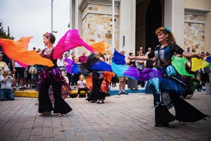 In this lively photograph, dancers adorned in colorful costumes passionately sway their flowing fabric, creating a mesmerizing display of movement. The mood is festive and vibrant, amplified by the enthusiastic crowd that watches in awe. Soft, natural lighting enhances the colors of the fabric and the joy on the performers' faces, capturing the spirit of celebration.