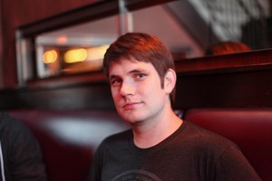 The photograph captures a young man seated in a cozy, dimly lit setting, evoking a relaxed yet contemplative mood. His gaze is calm and introspective, contrasting with the warm, blurred background lights that suggest a lively environment just out of focus. The composition highlights his expression, anchored by the rich colors of the surrounding furnishings, creating an intimate atmosphere.