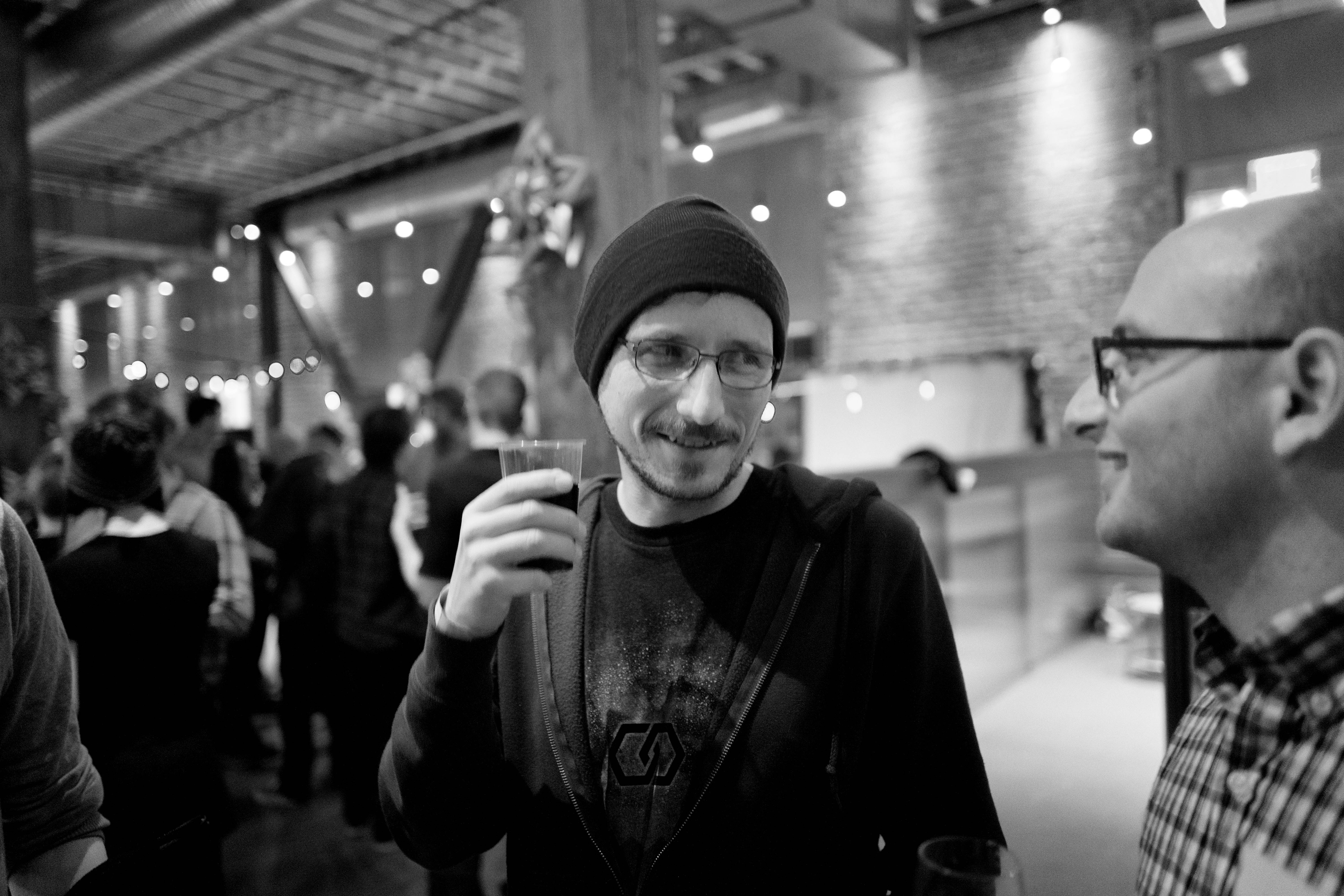 In a dimly lit venue, a man wearing a beanie and glasses holds a drink, engaged in light conversation with a companion. The warm glow of string lights and the soft focus of the crowd behind them creates a cozy, intimate atmosphere, highlighting the playful exchange between the two. The monochrome tone adds a nostalgic flair, enhancing the mood of camaraderie and relaxed enjoyment.