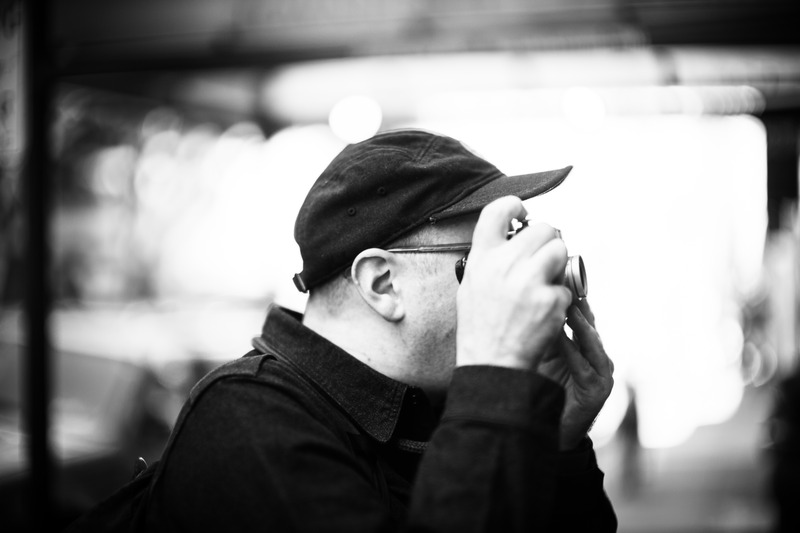 A lone photographer stands against a blurred urban backdrop, his profile framed by the soft glow of out-of-focus lights. The monochrome palette creates a somber yet contemplative mood, emphasizing the act of capturing fleeting moments. His intense focus suggests a deep connection to his craft, inviting viewers to ponder the stories behind the lens.