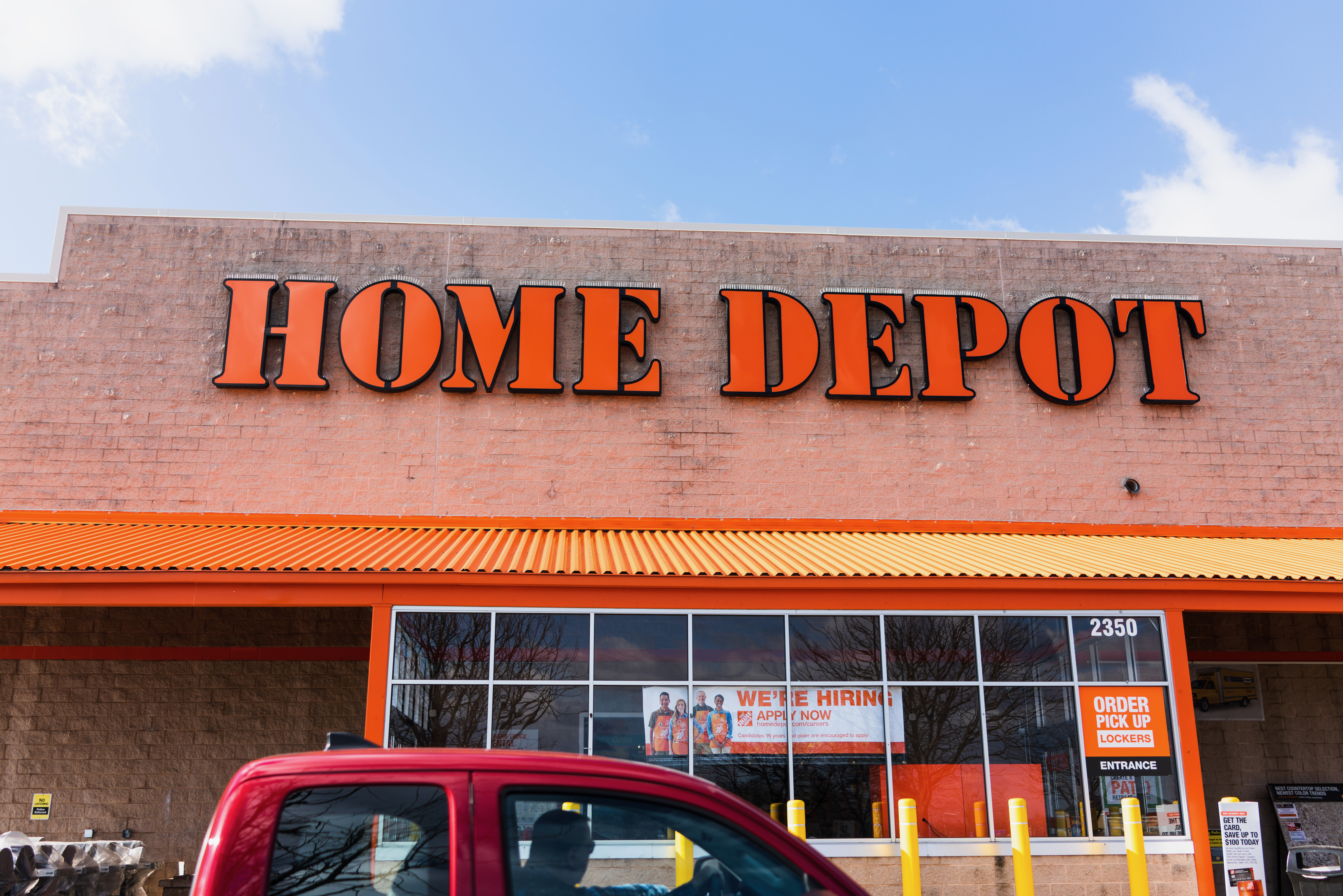 This photograph captures the bold exterior of a Home Depot store, bathed in natural light that highlights its bright orange signage. The composition emphasizes the store’s inviting atmosphere, complemented by a blue sky backdrop. A passing red truck adds a dynamic element, suggesting activity and engagement within this bustling retail environment.