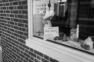 Through a charming shop window, a handwritten letter to Santa sits among nostalgic toys and a flickering candle, evoking a warm sense of childhood wonder. The monochrome tones heighten the mood, drawing attention to the simple yet poignant elements of the festive theme. Shadows from the surrounding brick wall add depth, creating an intimate glimpse into a moment filled with holiday hopes.