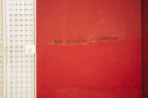 This photograph captures a striking contrast between a vibrant red wall and a stark metal security grate. The hand-painted message, 'NO SLEEPING or LOITERing,' evokes a mood of restriction and urban vigilance. Soft, natural lighting enhances the texture of the wall while invoking a contemplative sense of place and formality in the environment.