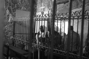 Enclosed within ornate wrought iron bars, a group of worshippers stand in quiet contemplation, their expressions a mix of devotion and solemnity. The stark black and white lighting casts deep shadows, enhancing the mood of reverent introspection. A simple cross on the wall serves as a poignant focal point, symbolizing faith amidst the confinement of the space.