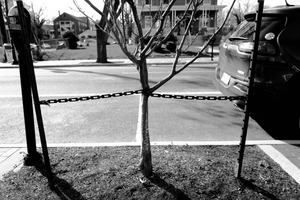 This monochromatic photograph captures a stark urban scene where a bare tree is visually restrained by a chain, juxtaposed against a parked car and a parking meter. The contrast of light and shadow emphasizes the tree's vulnerability, evoking a mood of confinement and resilience within the structured chaos of city life. The composition draws the eye from the chain to the tree, inviting contemplation on nature's place within an urban environment.