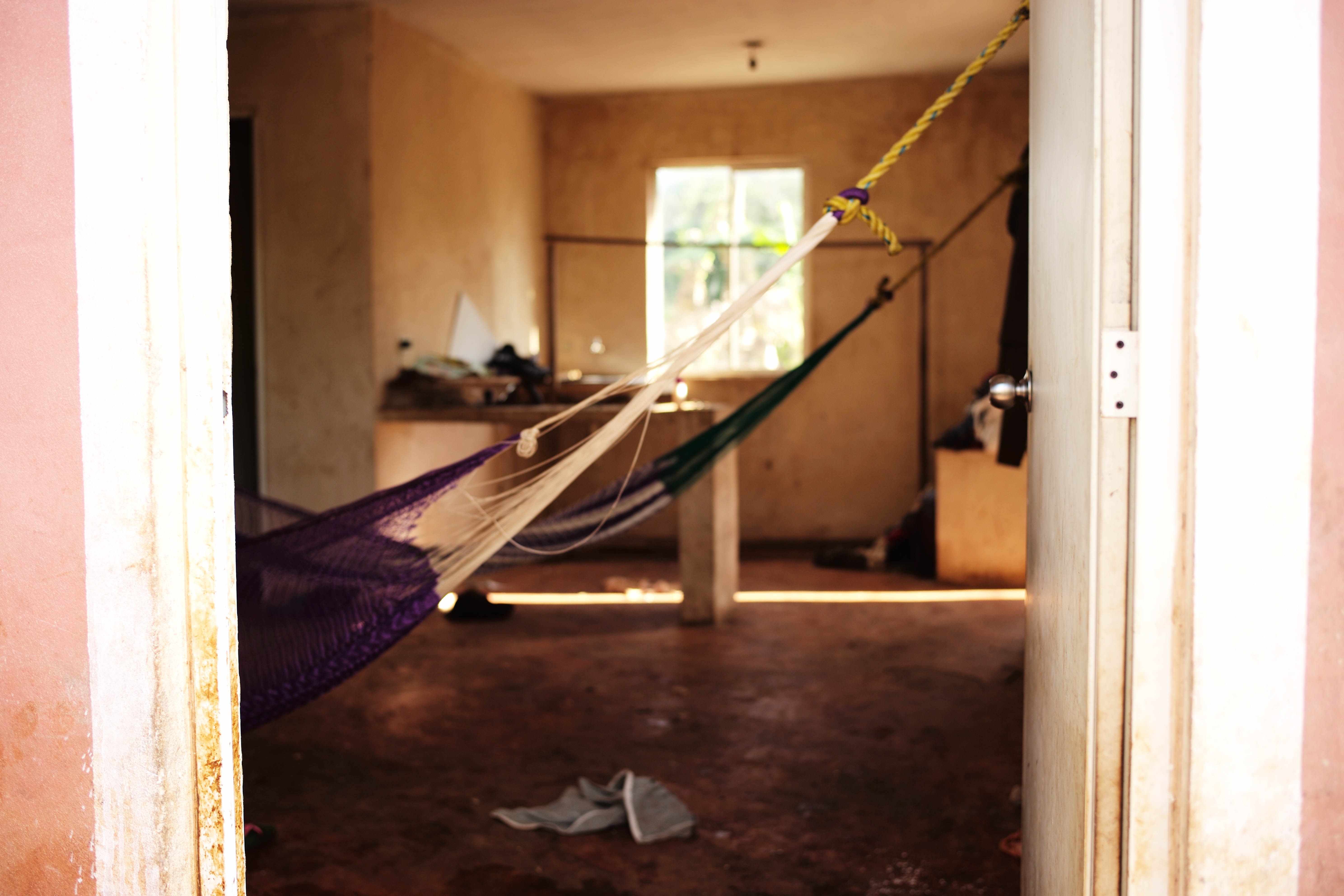 This photograph captures a tranquil indoor space framed by a doorway, showcasing a gently swaying hammock. The soft, warm light floods the room, highlighting the worn textures of the walls and floor, while hints of clutter suggest a lived-in, relaxed atmosphere. The composition invites viewers to ponder the calm simplicity of life, with the hammock serving as a focal point of rest and leisure.