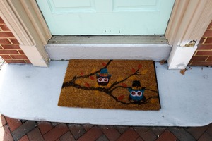 A charming doormat featuring two colorful owls perched on a branch exudes a playful and inviting mood. The soft light illuminates the texture of the mat and highlights the mint green door in the background, creating a warm and welcoming atmosphere. The composition draws the eye to the friendly owls, setting a cheerful tone for anyone arriving at the doorstep.